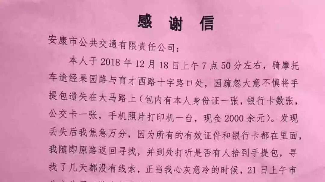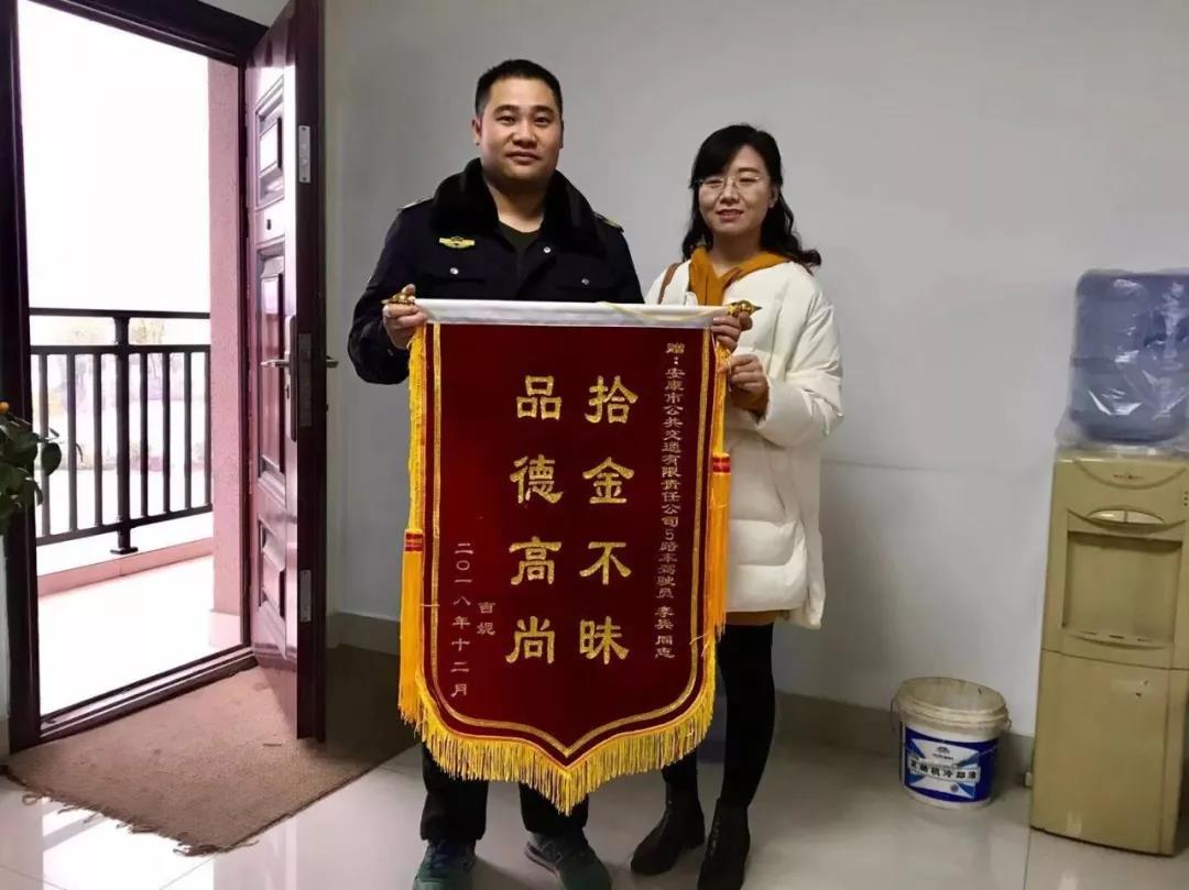 據(jù)失主吉某介紹,她是在12月18日早上的7點50分左右,騎摩托車途徑果園路與育才西路十字路口處,不慎將手提包遺失在馬路上。發(fā)現(xiàn)包丟失之后焦急萬分,隨即原路返回尋找,并四處打聽是否有人拾到手提包,尋找了幾天都沒有線索,正當(dāng)她心灰意冷的時候,接到了李師傅的電話。兩人確認(rèn)后,當(dāng)天下午,失主吉某來到安康市公交公司領(lǐng)取自己遺失的手提包。并將一面印有“拾金不昧品德高尚”的錦旗和一封感謝信送到公交公司車隊辦公室。